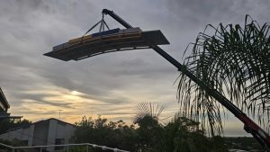 If you have a project with difficult access we can come up with all sorts of solutions. Our North Curl Curl project currently under way has required a number of deliveries be craned up to site, Gyprock, cladding, steel even the kitchen bench.
