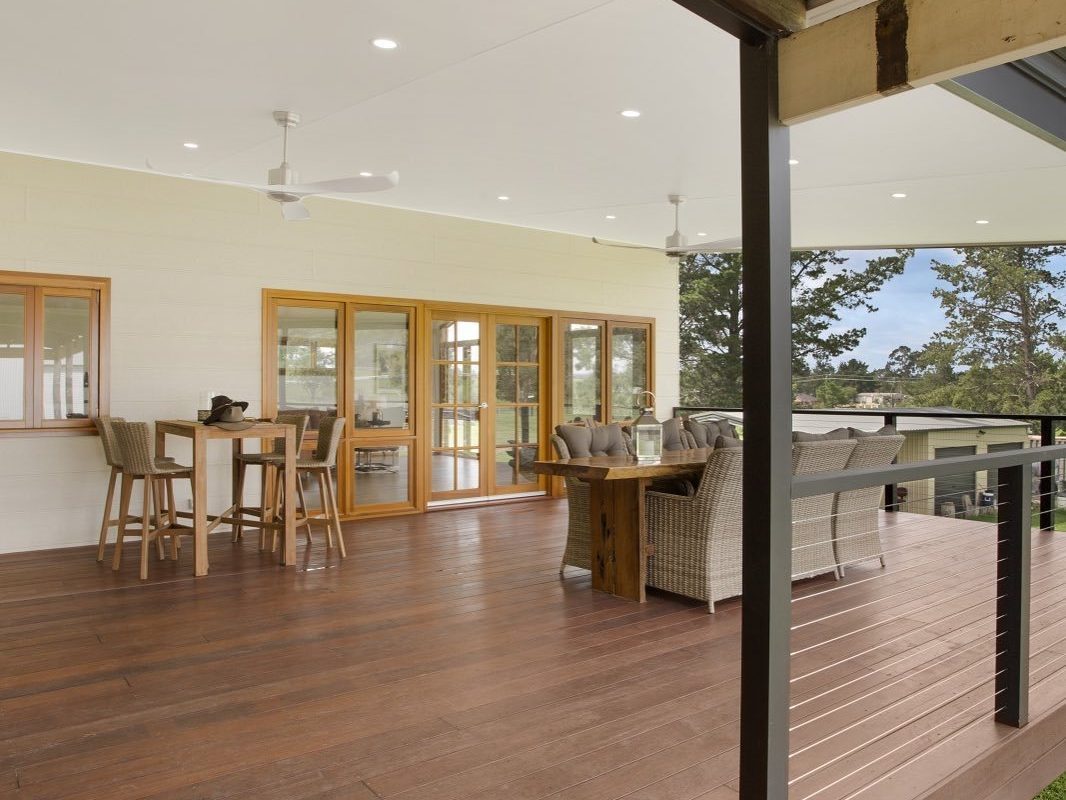 Includes Modwood timber decking face fixed with stainless steel screws, balustrade with dressed timber posts and handrail and stainless steel cables. Clear cedar doors and windows, weathertex cladding and colourbond roof with WR board ceiling.